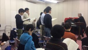 12/21(木)は今年最後の定例練習でした。小川さんのトレーニングの後、新倉先生のご指導で「うたを うたう とき」を練習しました。