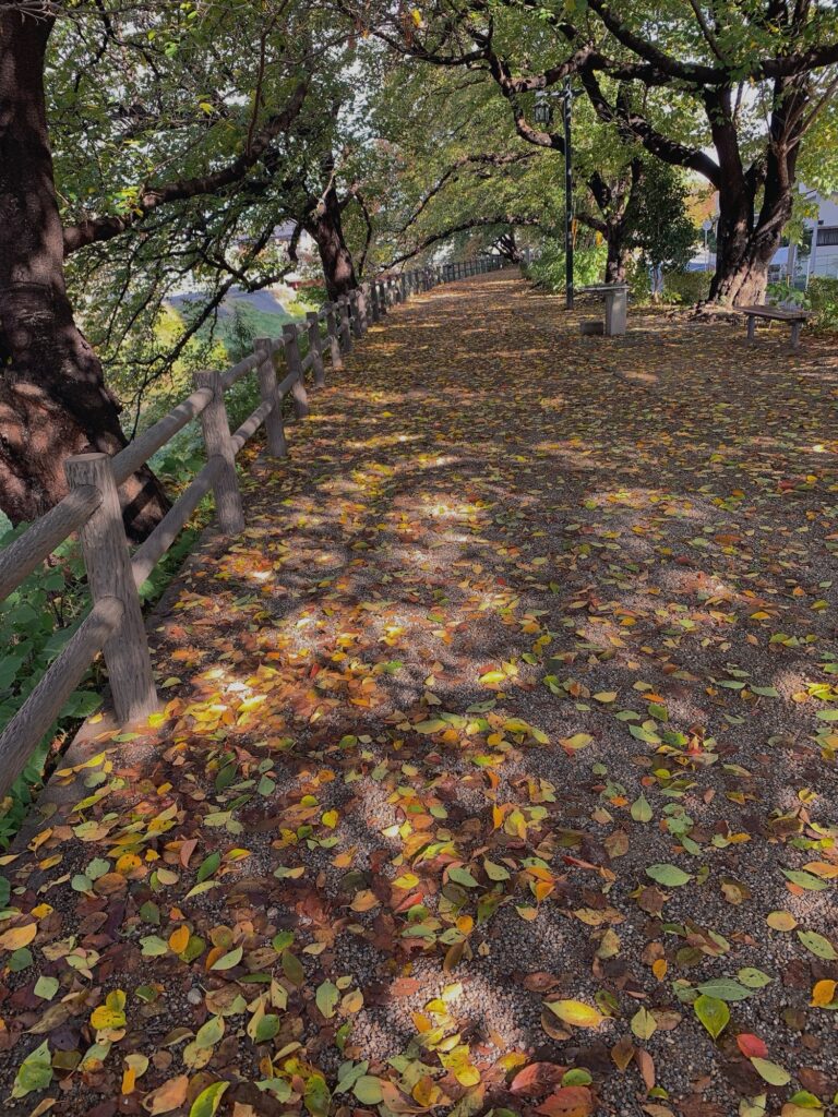 この間、桜土手を散策。落ち葉が心地良く、歩くと落ち葉の音に癒されました。