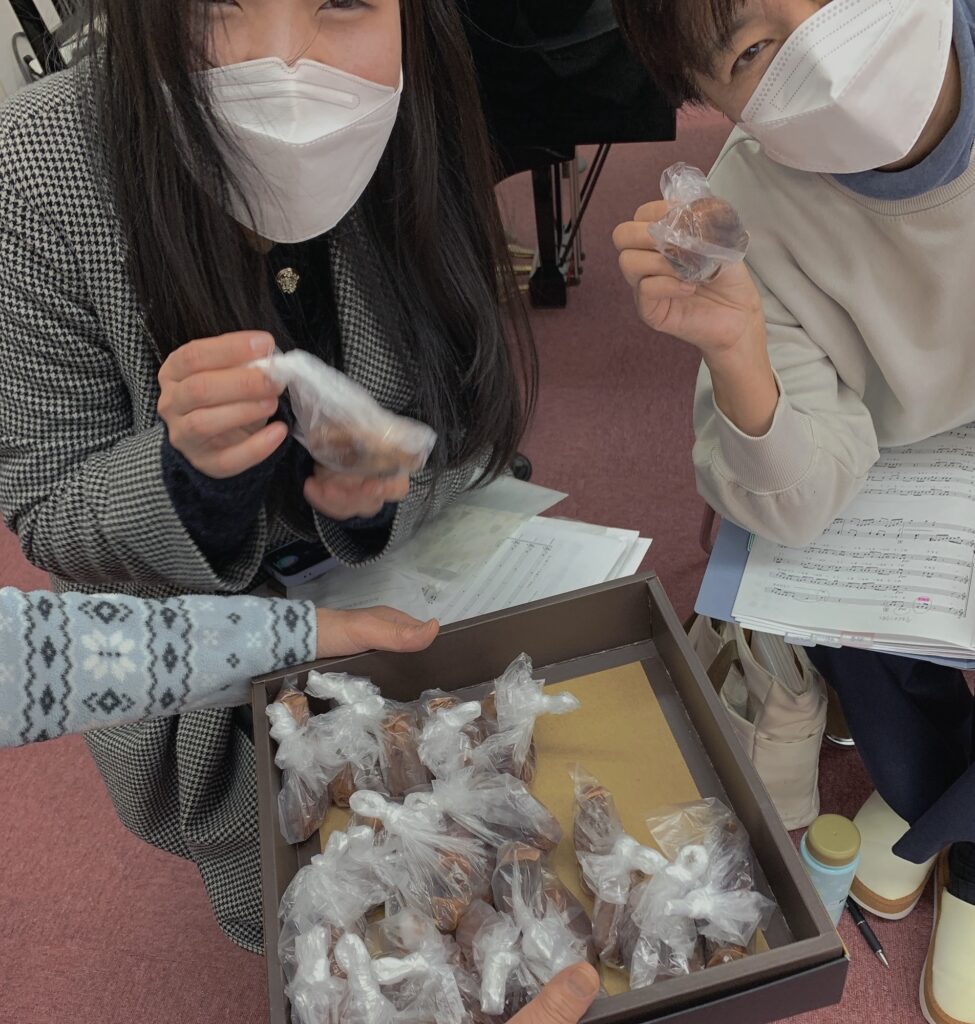 休憩時間、ソプラノOさんより、干し柿をいただきました。ありがとうございました。すみません、2人の可愛い顔が半分しか、写ってませんでした。未熟者です…。